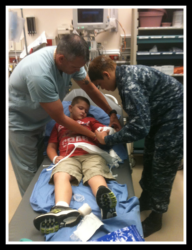 Update to the update: We were BACK at the Naval Hospital again today because the cast was rubbing in a couple of places. So, we have yet another cast. The third in three days... I feel like we've spent so much time at the Naval Hospital that I ought to add those Corpsmen to my Christmas list!!